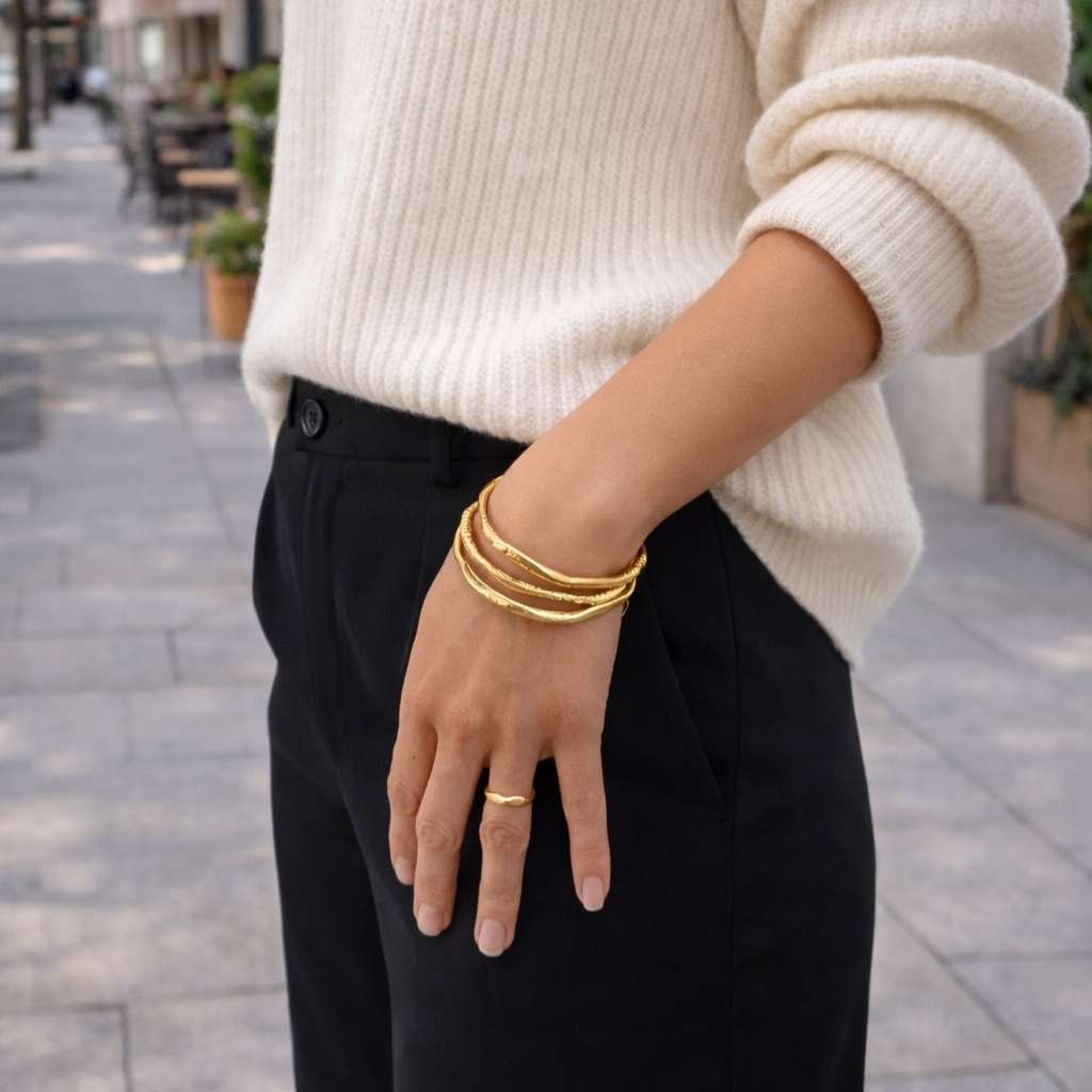 Porté seul, il révèle toute la finesse de son relief. En accumulation, il compose une silhouette sophistiquée, libre et affirmée.
