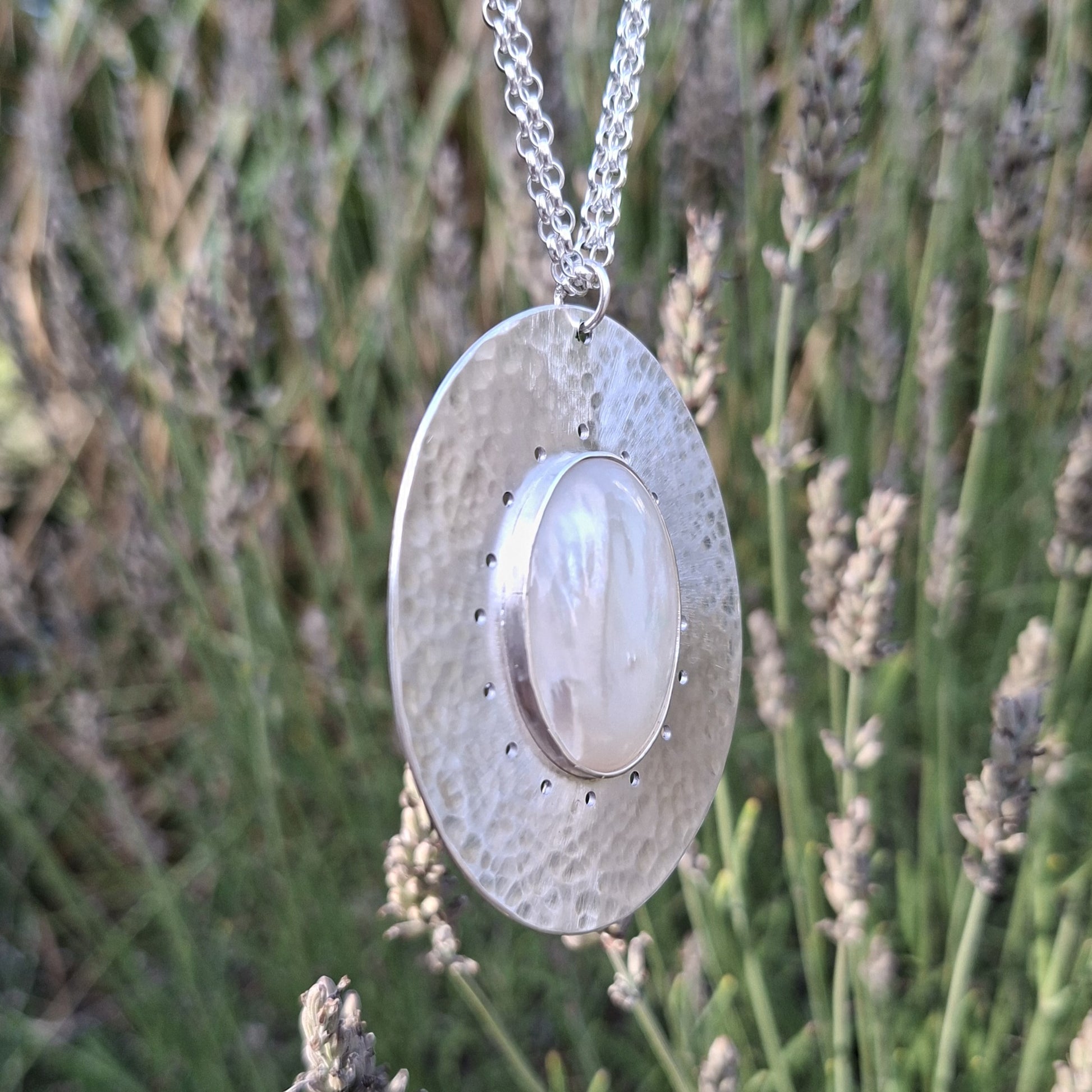 Collier en argent massif martelé et nacre blanche