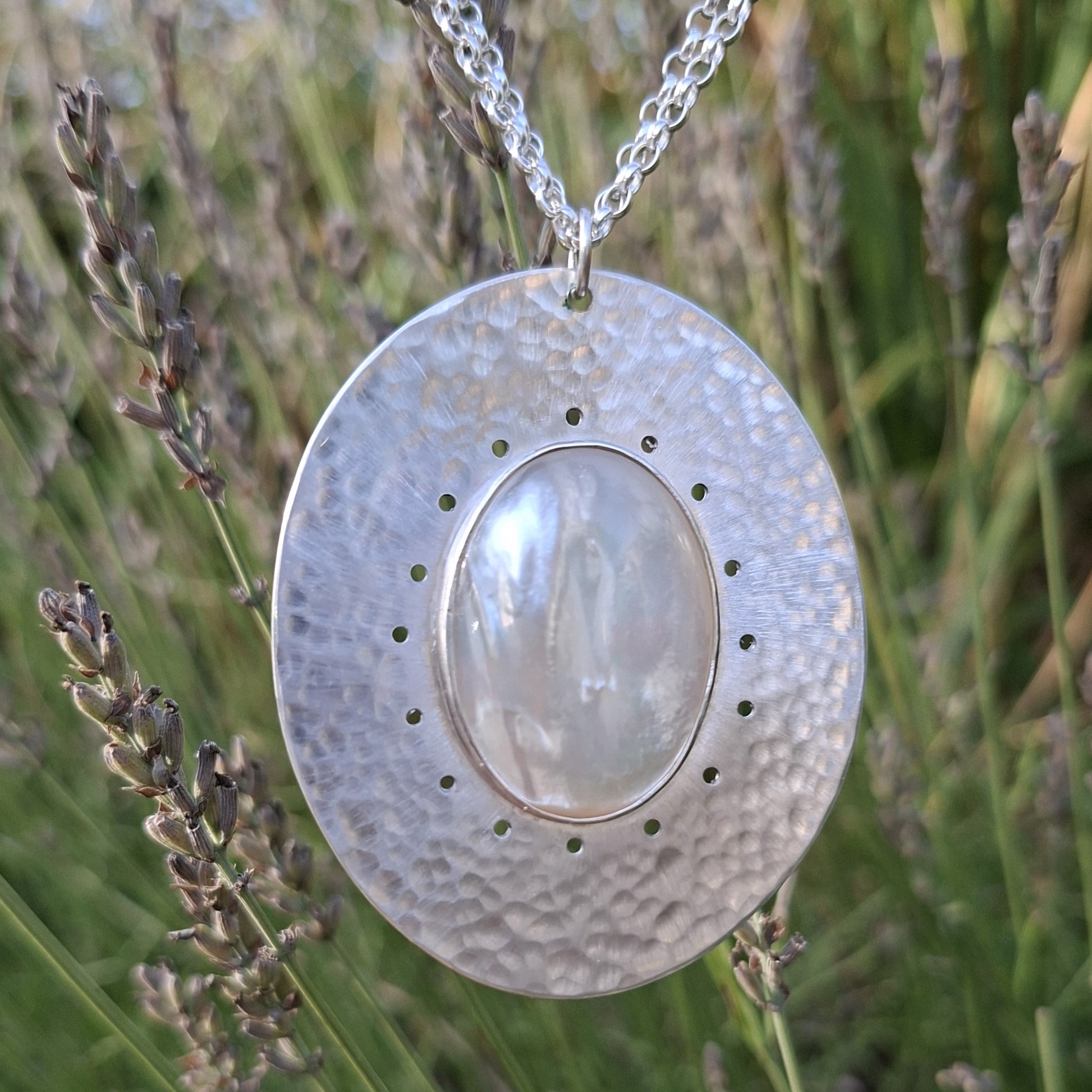 Collier en Argent Massif martelé et Nacre blanche